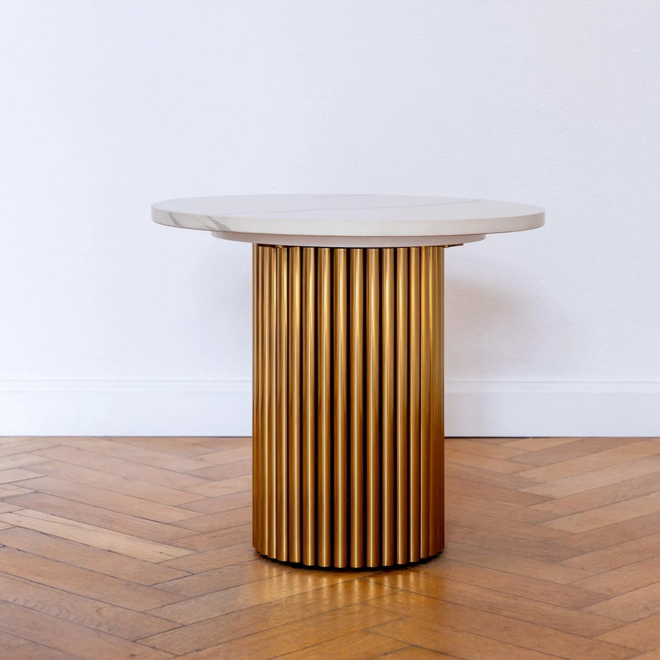 Afinia Shell Gold kahvipöydässä yhdistyy moderni muotoilu poikkeukselliseen kestävyyteen ja eleganssiin. Pöytätaso on kvartsisinneriä, joka on paitsi näyttävä, kestää hyvin naarmuuntumista ja iskuja vastaan.