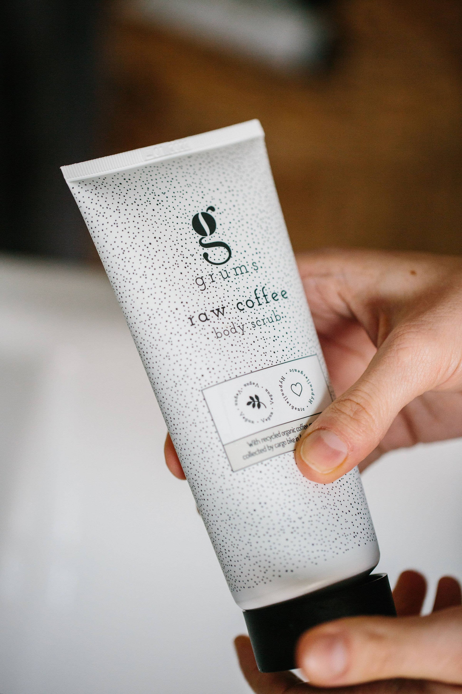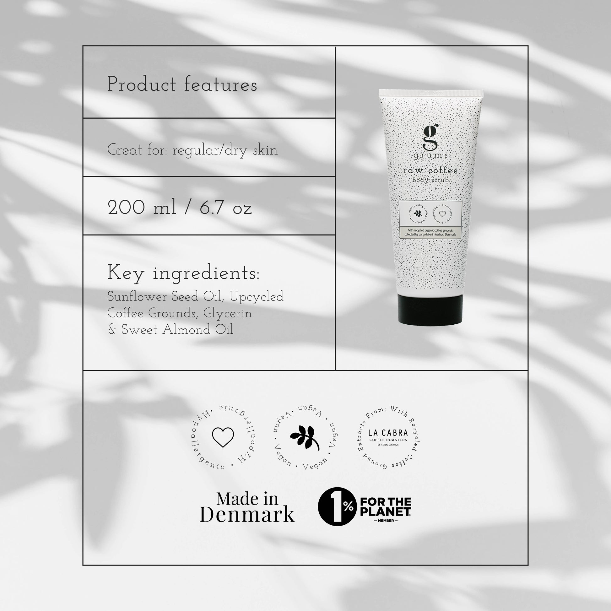 Grums raw coffee body scrub on valmistettu luonnollisista, vegaanisista ainesosista sekä kierrätetyistä suodatinkahvin puruista, jotka antavat tuotteelle karkean ja tehokkaan koostumuksen. Tämä tekee siitä täydellisen syväpuhdistavan mutta hellävaraisen vartalon kuorintaan.